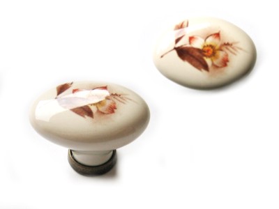 Pomolo Ovale 24 X 34 mm in Porcellana Avorio Fiore Autunnale Base Anticato