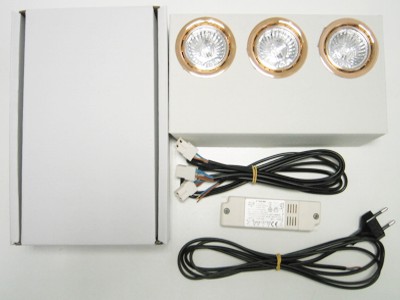 Kit 3 Faretto Alogeno Ottonato con V. di Prot.Trasp. e Lamp. 20 W 12V Incas. 60 mm e Att. Rapido FAST-IN e Trasform. elettronico 60 W e cavi