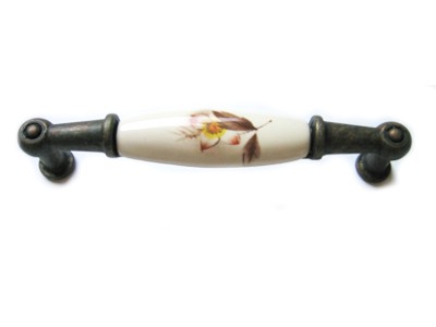 Maniglia Int. 96 mm Anticato con Inserto in Porcellana Avorio e Fiore Marrone