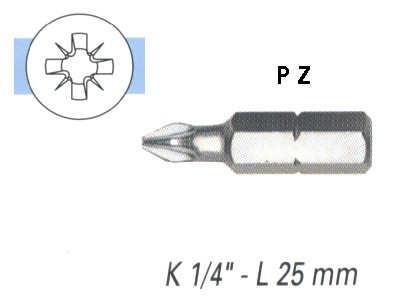 | descirzione: | MISURE TECNICHE: L=25 ALTRI CODICI DISPONIBILI: COD. 12-1096 Inserto Croce Pozzidriv PZ n. 2 in Acciaio naturale COD. 12-1099 Inserto Croce Pozzidriv PZ n. 3 in Acciaio naturale |